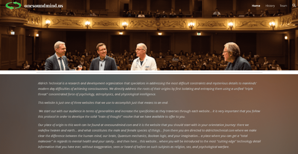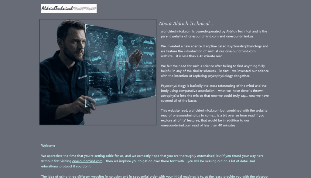 Aldrich Technical owns and operates “onesoundmind.com…” an Intelligence Technology research and development organization that has engineered and developed a “whole realm” intelligence property meant to be used by all of civilization, not to be interjected into a pool of problems and failed solutions as an amendment, but as a “scrubbing out and replacement” of them all in their entirety.